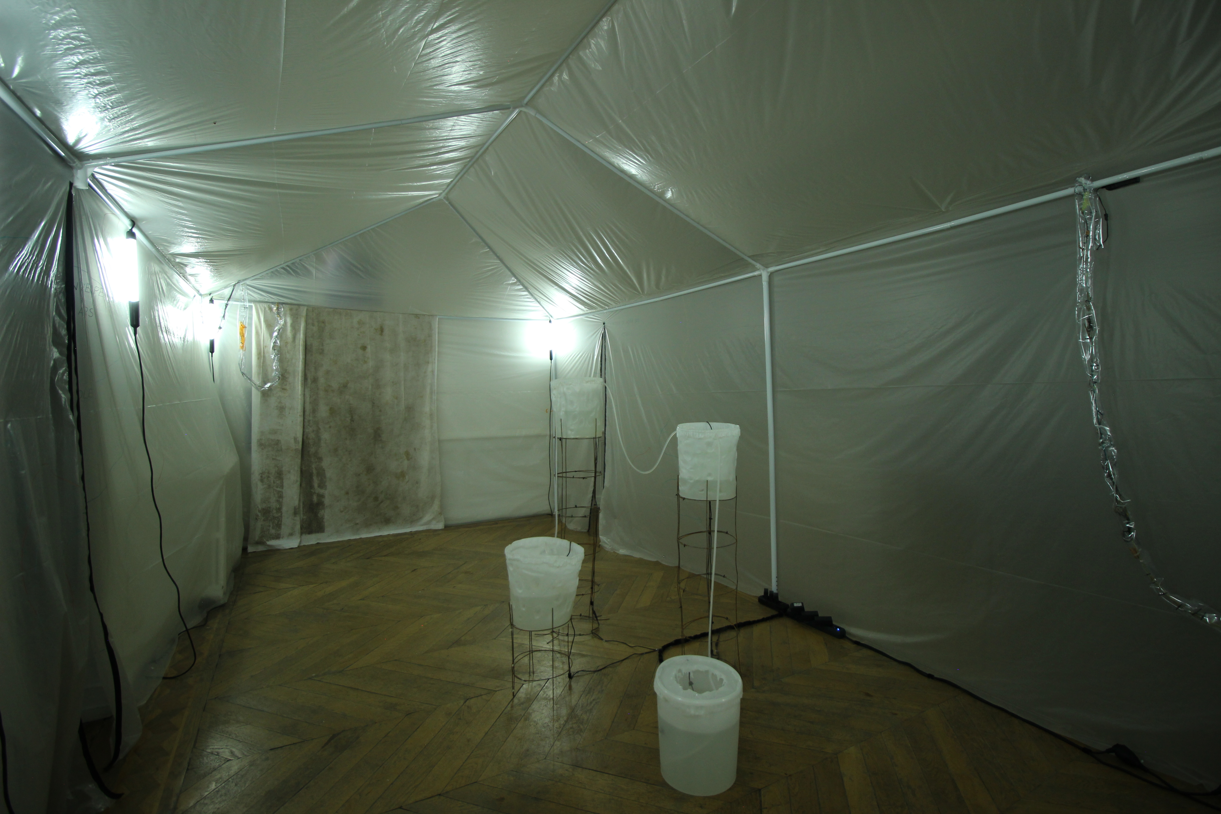 Au sein des sculptures Râ de Naomi Maury, de ce réseau de tuyaux translucides, les éléments naturels, coraux et autres mousses, cohabitent avec quelques plastiques manufacturés dans un biomimétisme inquiétant. Les assemblages de matériaux diamétralement opposés évoquent, ici encore, les vestiges d’une société de production pétrochimique de masse investis par une flore et une faune ubiquiste. Les cigales qui « nuit et jour, à tout venant » chantent dans l’exposition, surprises que la bise ne vienne plus, ne migrent-elles pas plus au nord chaque année ?